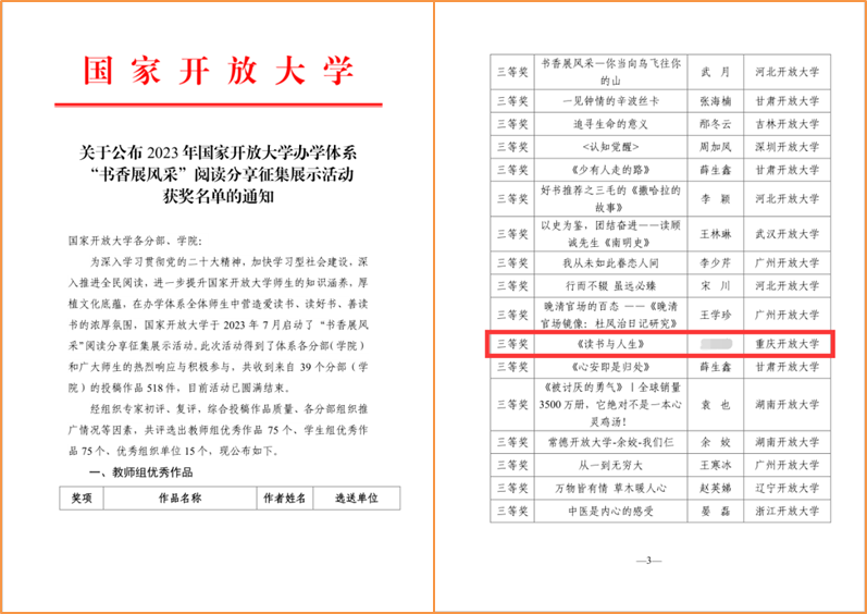 校图书馆在2023 年国家开放大学办学体系“书香展风采”阅读分享征集展示活动中获得三等奖